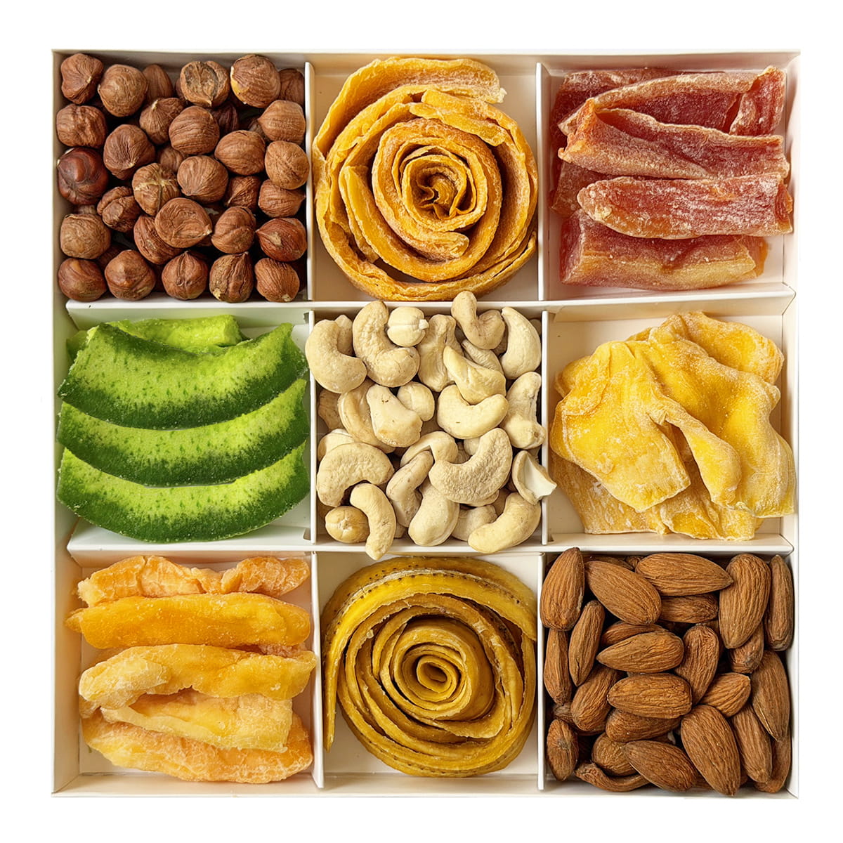 - Składniki Migdał kalifornijski 70g, kantalupa suszona 60g, papaja suszona 60g, orzech laskowy 60g, jackfruit suszony 50g, mango suszone 70g, banan suszony 50g, pomelo suszone 40g, nerkowiec extra 60g